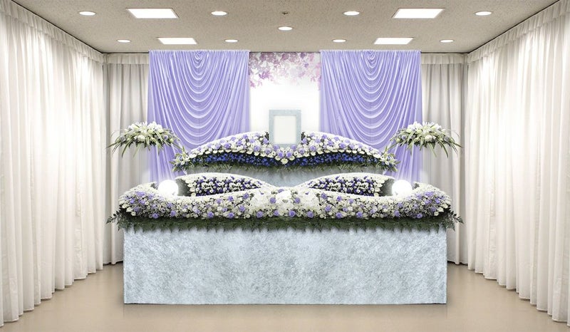 白と紫をベースとしたやわらかで優しいく落ち着いた花祭壇です。