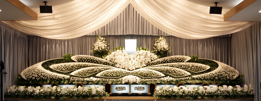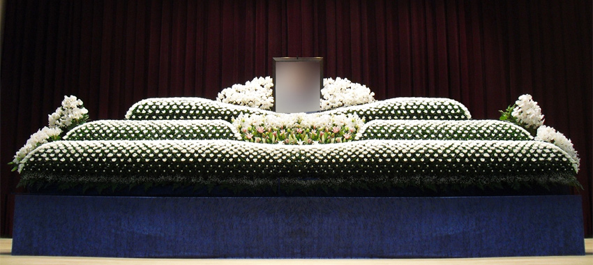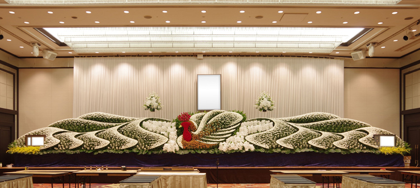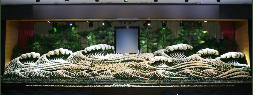 「法人のお別れの会(社葬)」では、故人の功績を背景とした荘厳な花祭壇をご希望されるケースが大変多いです。FLABELは、どんな造形でもお花で絵を描くように装飾できることが強みです。