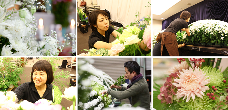 葬儀の花屋のプロとして、どのようなご希望も叶える事ができるプロ集団として、お客様にご安心していただけるよう装飾をさせていただきます。フラベルでは様々なご葬儀の装飾を請け負うため、キャリア20年以上のスタッフを中心に日々技術力の向上に努めています。